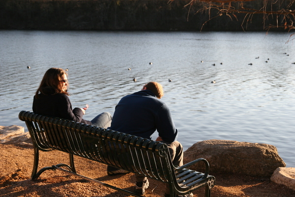 Two of my friends sitting on a park bench
