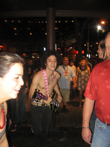 Which included their guitarist (playing with bright pink guitar strings) taking off his shirt and jumping around in the middle of 6th street
